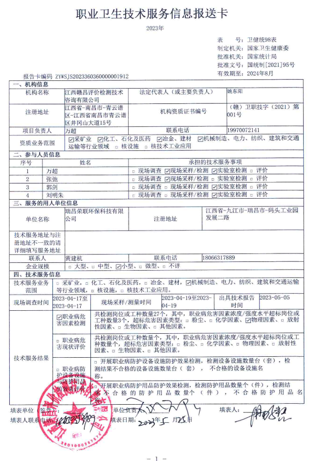 瑞昌榮聯(lián)環(huán)??萍加邢薰竟ぷ鲌鏊殬I(yè)病危害因素檢測報告