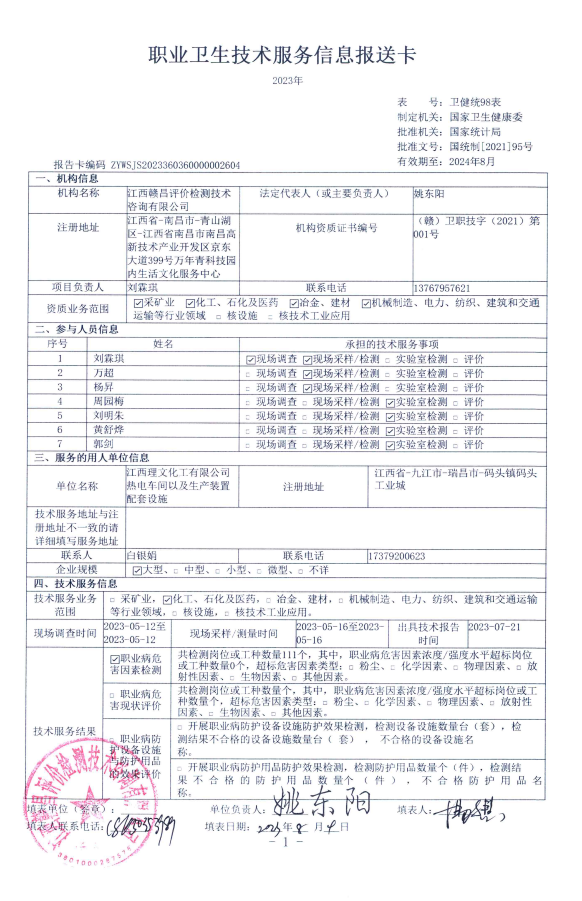 江西理文化工有限公司熱電車間以及生產(chǎn)裝置配套設(shè)施工作場所職業(yè)病危害因素檢測報(bào)告