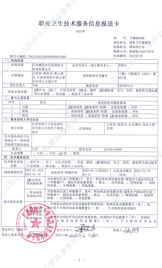 江西省海之天新能源技術(shù)有限公司南昌大橋加油站工作場(chǎng)所職業(yè)病危害因素檢測(cè)報(bào)告