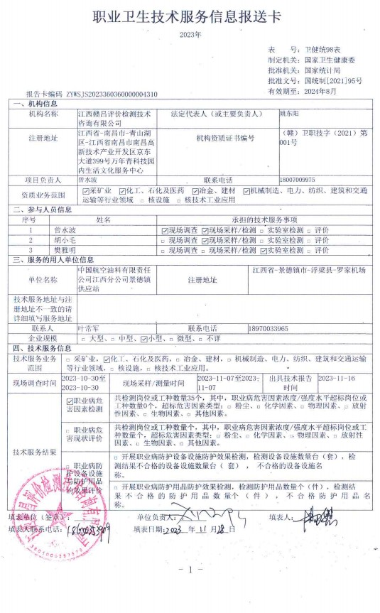 下一篇:中國航空油料有限責(zé)任公司江西分公司井岡山供應(yīng)站工作場所職業(yè)病危害因素檢測報(bào)告