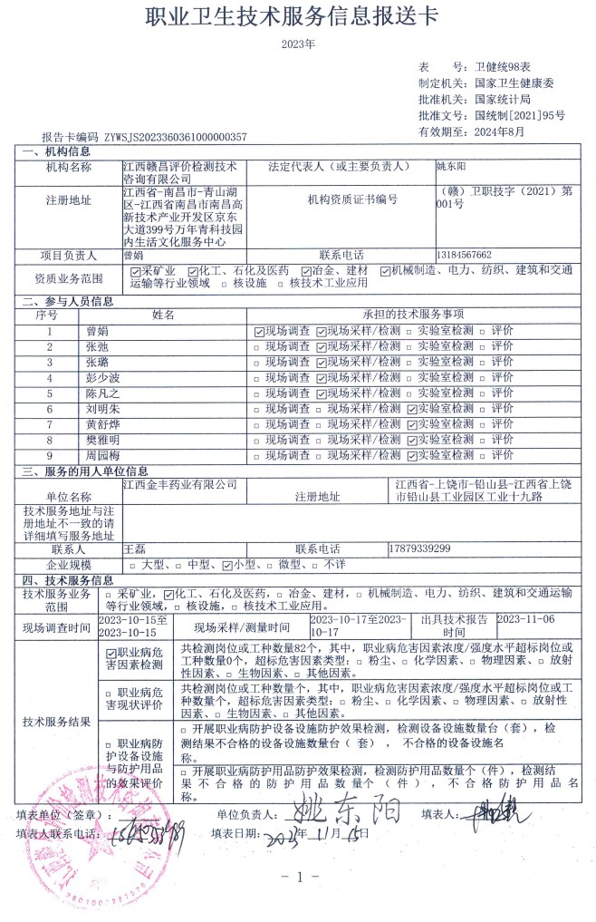 江西金豐藥業(yè)有限公司工作場所職業(yè)病危害因素檢測報告