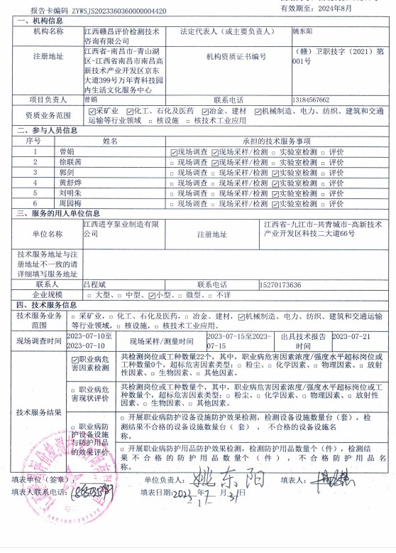 江西進(jìn)亨泵業(yè)制造有限公司工作場所職業(yè)病危害因素檢測報告