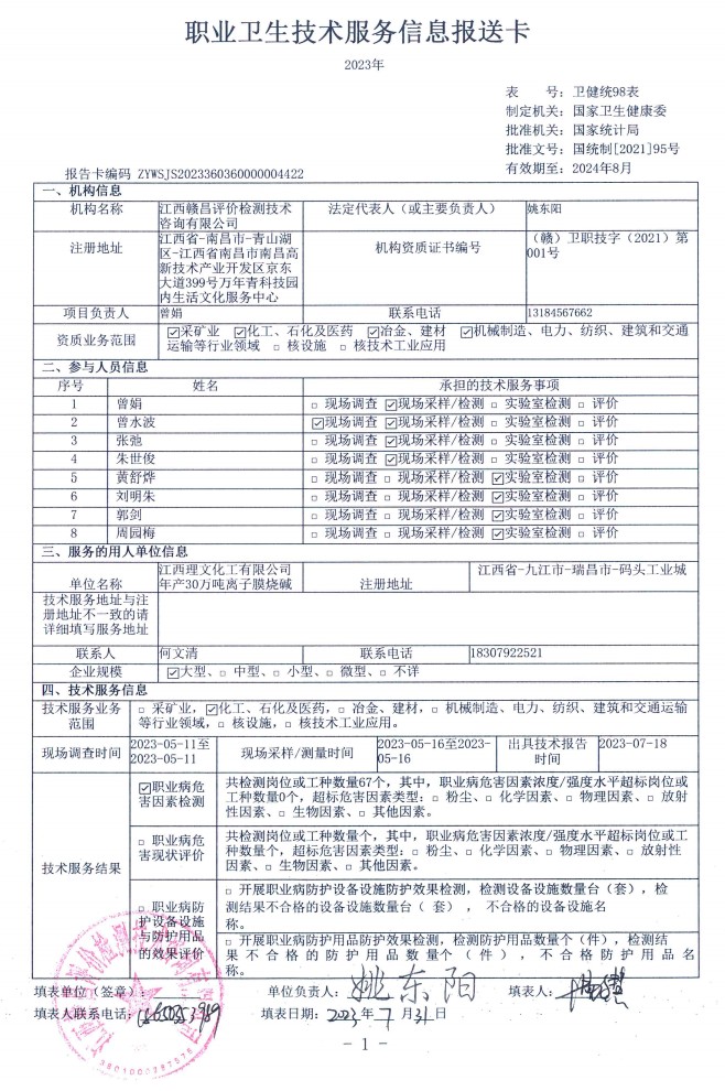 下一篇:江西理文化工有限公司年產(chǎn)20萬(wàn)噸聚合氯化鋁生產(chǎn)裝置工作場(chǎng)所職業(yè)病危害因素檢測(cè)報(bào)告