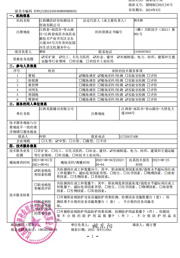 江西美晨通訊有限公司工作場所職業(yè)病危害因素檢測報告