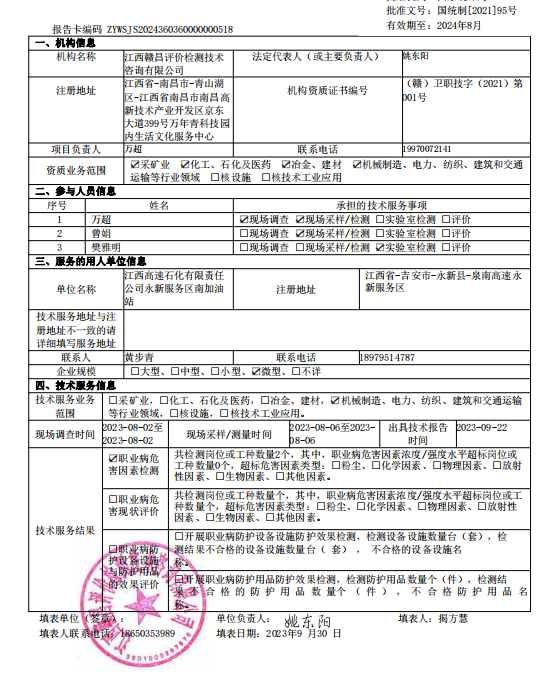 江西高速石化有限責任公司永新服務區(qū)南加油站工作場所職業(yè)病危害因素檢測報告
