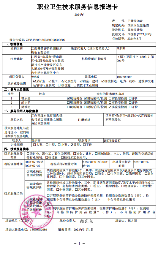 上一篇:江西高速石化有限責(zé)任公司武吉高速仙女湖服務(wù)區(qū)東加油站工作場(chǎng)所職業(yè)病危害因素檢測(cè)報(bào)告