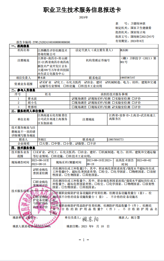 下一篇:江西高速石化有限責(zé)任公司武吉高速上高服務(wù)區(qū)西加油站工作場所職業(yè)病危害因素檢測報告