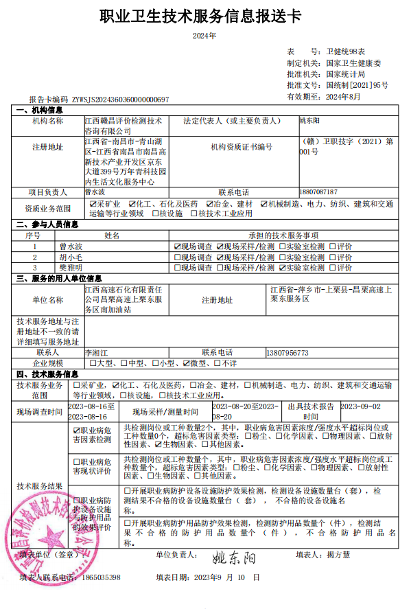 上一篇:《江西高速石化有限責(zé)任公司昌栗高速上栗東服務(wù)區(qū)北加油站工作場(chǎng)所職業(yè)病危害因素檢測(cè)報(bào)告》(報(bào)告編號(hào):GCJC-23-144-11)