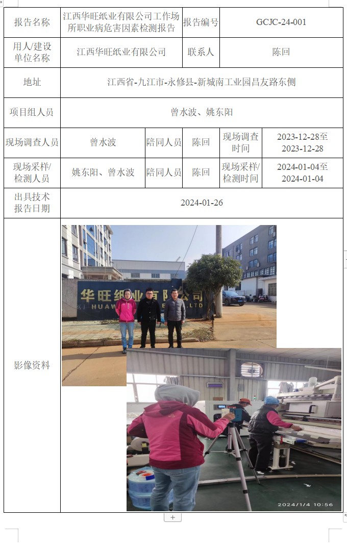 江西華旺紙業(yè)有限公司工作場所職業(yè)病危害因素檢測報告