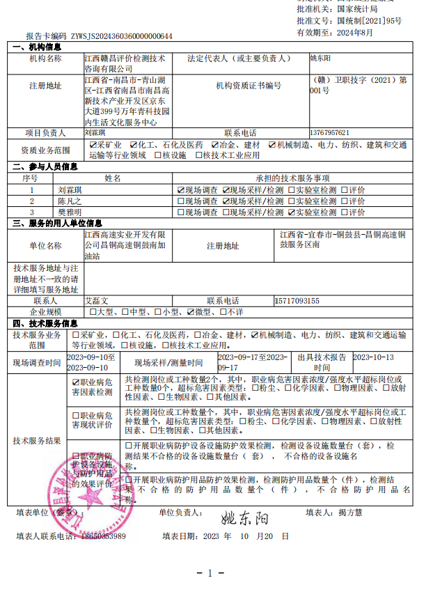 下一篇:《江西高速實(shí)業(yè)開發(fā)有限公司峽江服務(wù)區(qū)東加油站工作場所職業(yè)病危害因素檢測報告》(報告編號:GCJC-23-152-19)