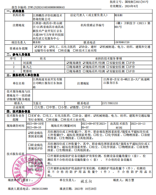 下一篇:《江西高速實(shí)業(yè)開發(fā)有限公司峽江服務(wù)區(qū)西加油站工作場所職業(yè)病危害因素檢測報(bào)告》(報(bào)告編號(hào):GCJC-23-152-20)