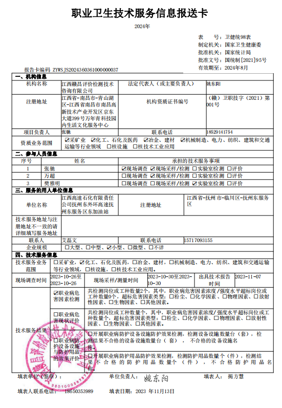 下一篇:《江西高速石化有限責任公司撫州東外環(huán)高速撫州東服務區(qū)西加油站工作場所職業(yè)病危害因素檢測報告》(報告編號:GCJC-23-141-14)