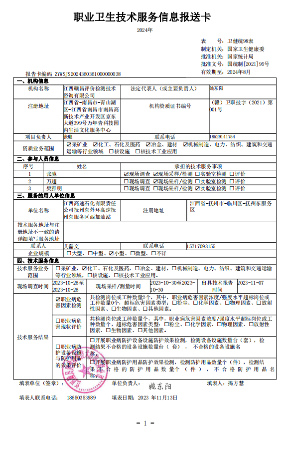 上一篇:《江西高速石化有限責(zé)任公司撫州東外環(huán)高速撫州東服務(wù)區(qū)東加油站工作場(chǎng)所職業(yè)病危害因素檢測(cè)報(bào)告》(報(bào)告編號(hào):GCJC-23-141-13)