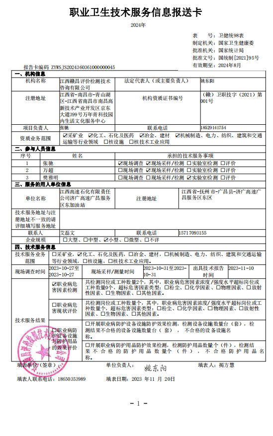 下一篇:《江西高速石化有限責任公司濟廣高速廣昌服務區(qū)西加油站》工作場所職業(yè)病危害因素檢測報告》(報告編號:GCJC-23-141-22)
