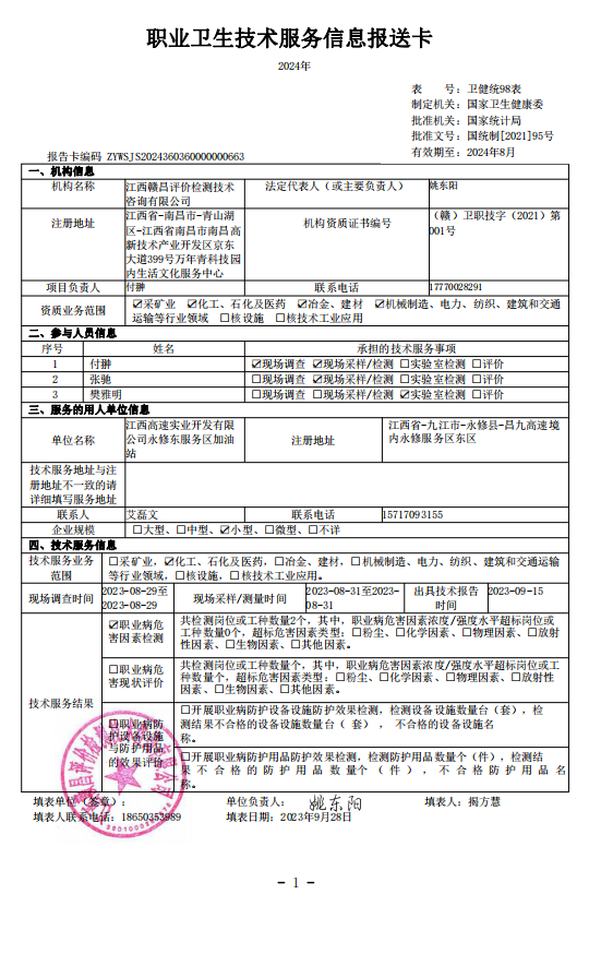 下一篇:江西高速實業(yè)開發(fā)有限公司永修西服務(wù)區(qū)加油站工作場所職業(yè)病危害因素檢測報告》(報告編號:GCJC-23-152-4)