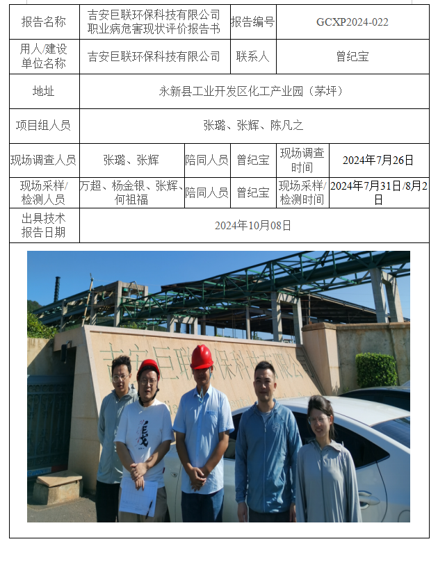 吉安巨聯(lián)環(huán)保科技有限公司 職業(yè)病危害現(xiàn)狀評價報告書GCXP2024-022