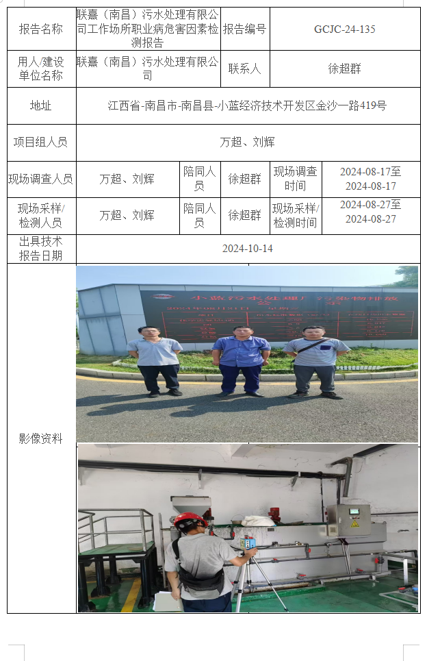 聯(lián)熹(南昌)污水處理有限公司工作場所職業(yè)病危害因素檢測報告