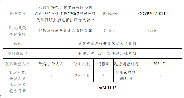 下一篇:江西華特電子化學(xué)品有限公司 年產(chǎn)15噸乙硅烷項(xiàng)目職業(yè)病危害控制效果評(píng)價(jià)報(bào)告書(shū)