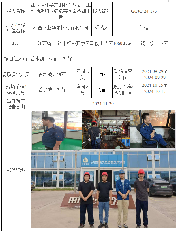 江西銅業(yè)華東銅材有限公司工作場所職業(yè)病危害因素檢測報告