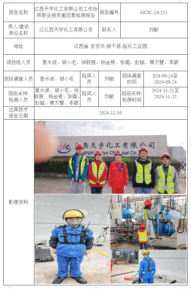 江西天宇化工有限公司工作場所職業(yè)病危害因素檢測報告