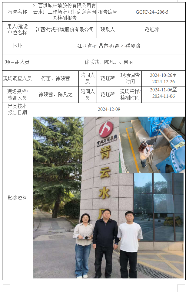江西洪城環(huán)境股份有限公司青云水廠工作場所職業(yè)病危害因素檢測報告