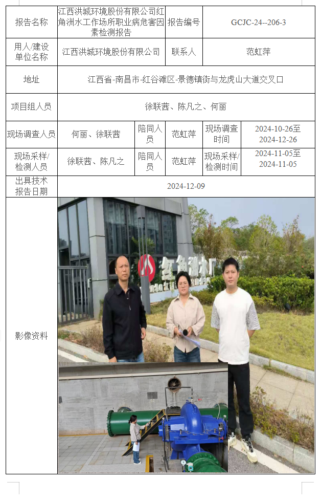 江西洪城環(huán)境股份有限公司紅角洲水工作場所職業(yè)病危害因素檢測報告