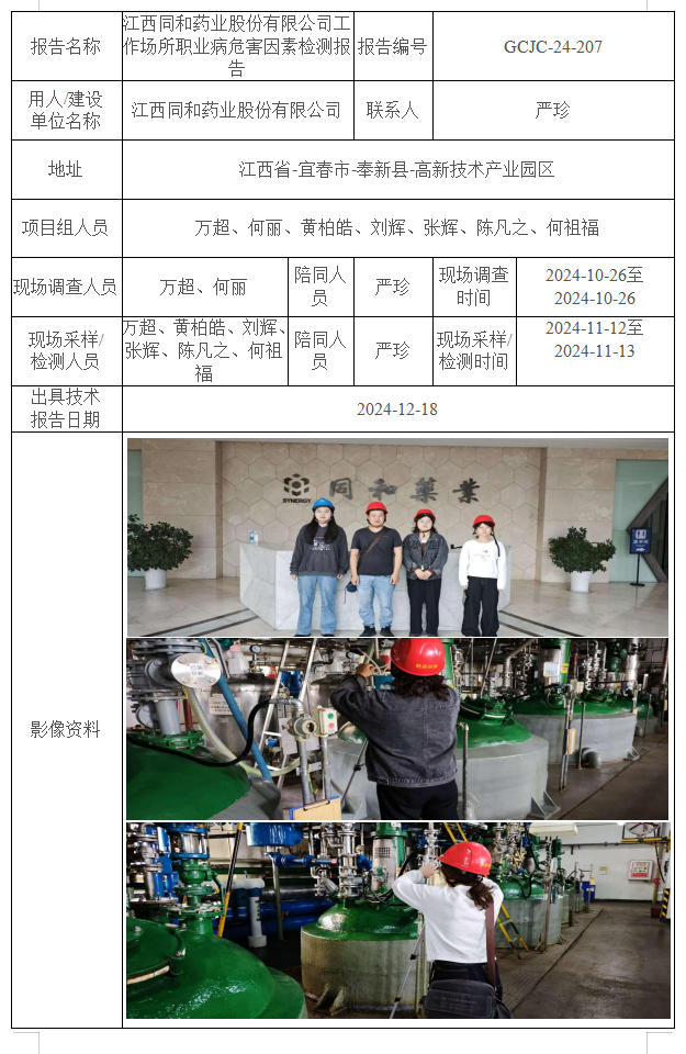 江西同和藥業(yè)股份有限公司工作場所職業(yè)病危害因素檢測報告