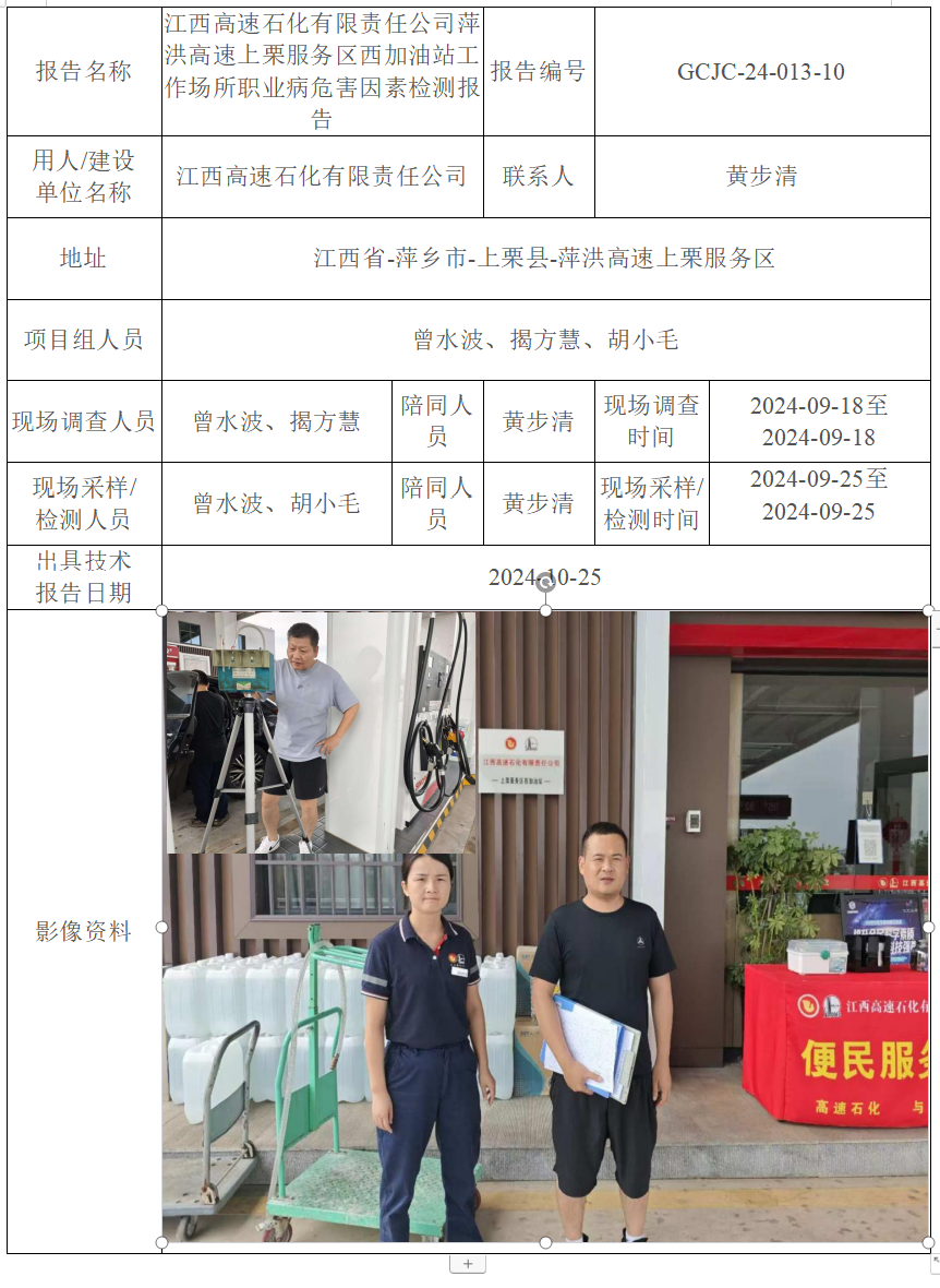 江西高速石化有限責(zé)任公司萍洪高速上栗服務(wù)區(qū)西加油站工作場所職業(yè)病危害因素檢測報告