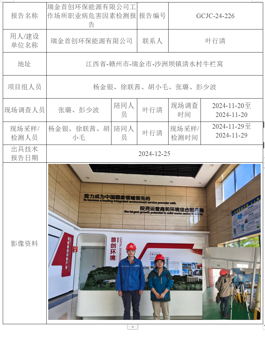 瑞金首創(chuàng)環(huán)保能源有限公司工作場所職業(yè)病危害因素檢測報(bào)告