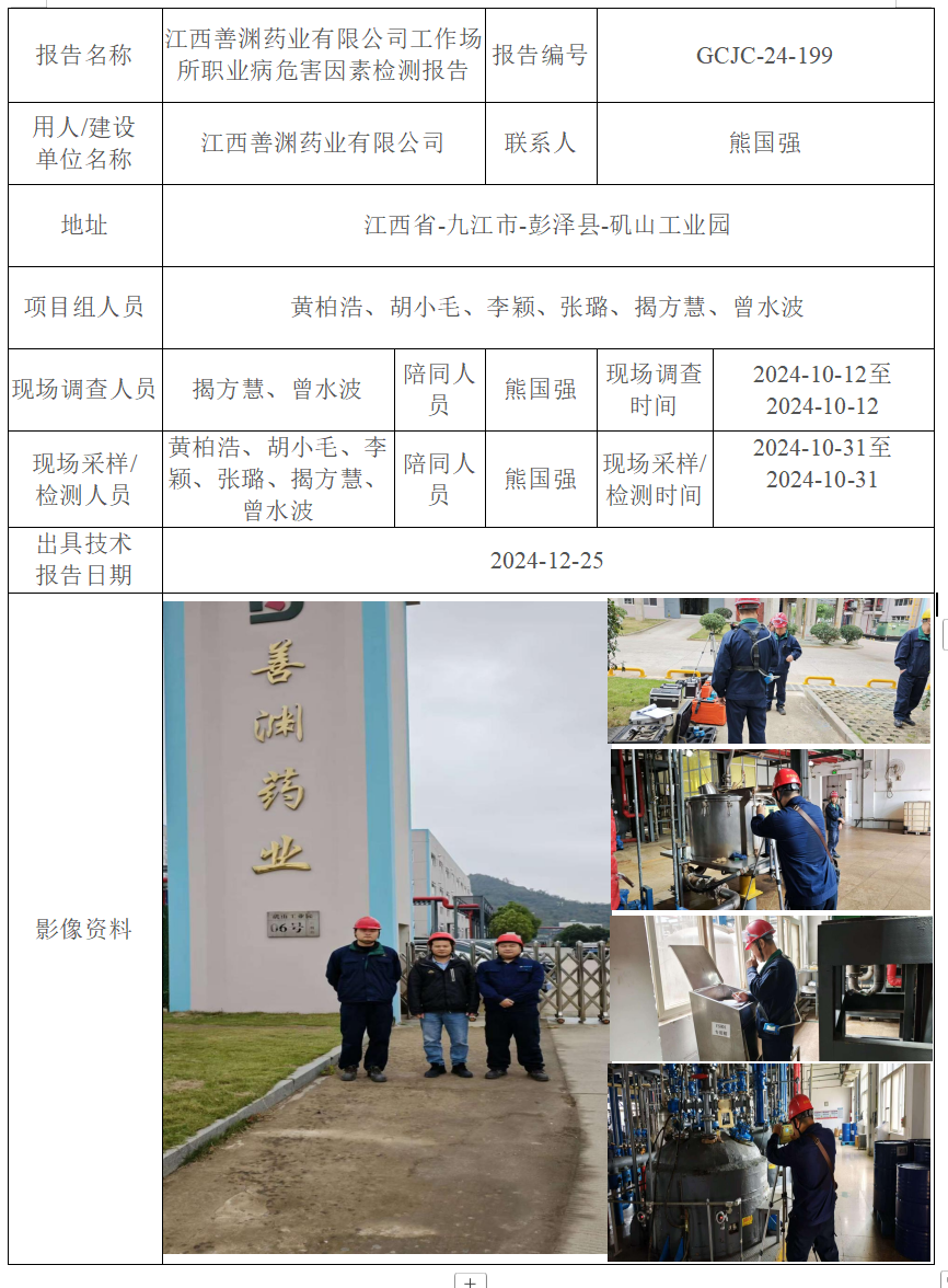 江西善淵藥業(yè)有限公司工作場所職業(yè)病危害因素檢測報告
