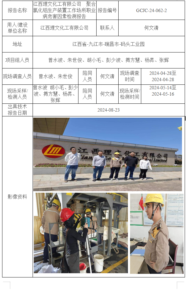 江西理文化工有限公司聚合氯化鋁生產(chǎn)裝置工作場所職業(yè)病危害因素檢測報告