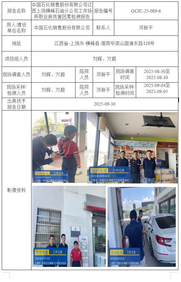 中國石化銷售股份有限公司江西上饒橫峰石油分公司工作場所職業(yè)病危害因素檢測報告