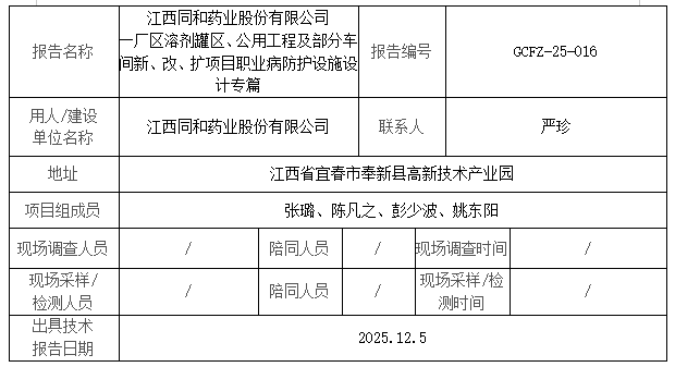 江西同和藥業(yè)股份有限公司 一廠區(qū)溶劑罐區(qū)、公用工程及部分車間新、改、擴項目職業(yè)病防護設(shè)施設(shè)計專篇