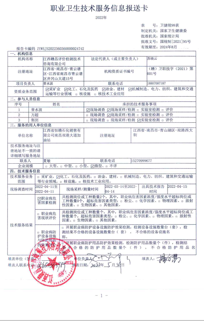 江西省恒贛石化銷售有限公司南昌雙港大道加油站工作場所職業(yè)病危害因素檢測報告
