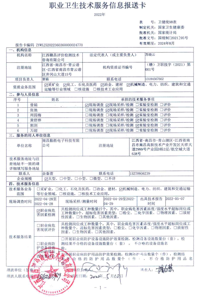 南昌勤勝電子科技有限公司工作場(chǎng)所職業(yè)病危害因素檢測(cè)報(bào)告