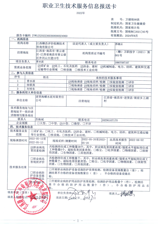 下一篇:江西廬山海螺水泥有限公司工作場(chǎng)所職業(yè)病危害因素檢測(cè)報(bào)告