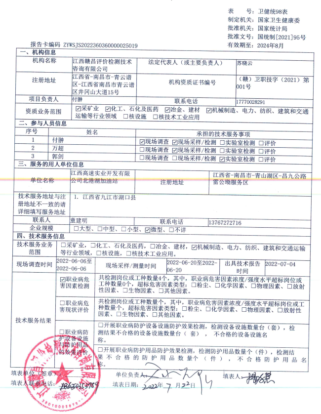 下一篇:江西高速實(shí)業(yè)開發(fā)有限公司梅林加油站工作場(chǎng)所職業(yè)病危害因素檢測(cè)報(bào)告