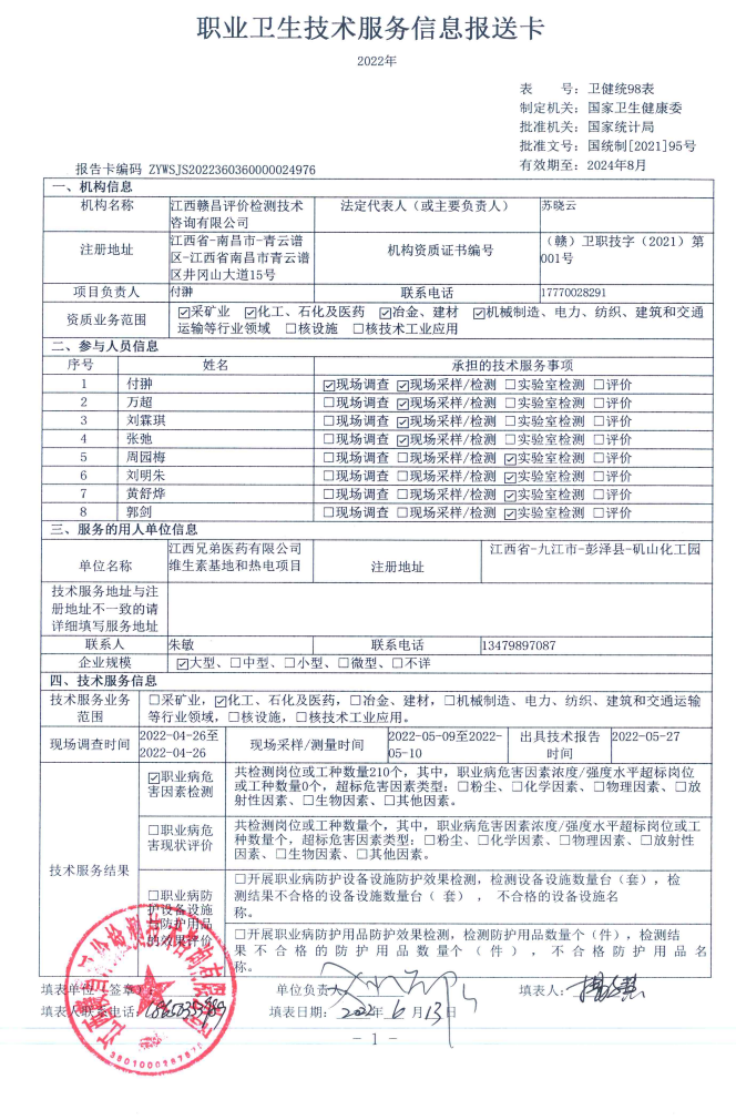 江西兄弟醫(yī)藥有限公司維生素基地和熱電項目工作場所職業(yè)病危害因素檢測報告