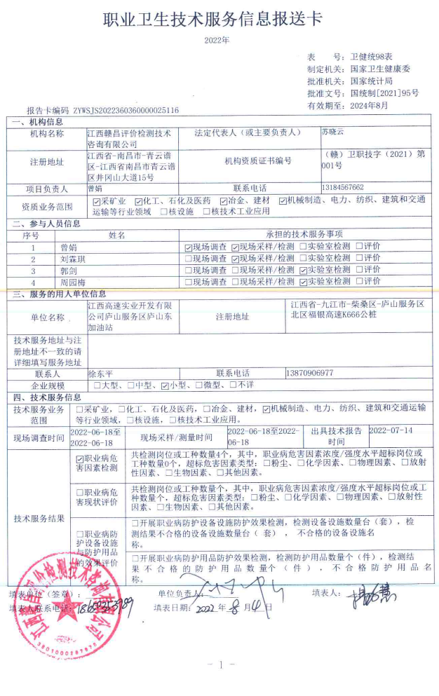 江西高速實業(yè)開發(fā)有限公司廬山服務(wù)區(qū)廬山加油站工作場所職業(yè)病危害因素檢測報告