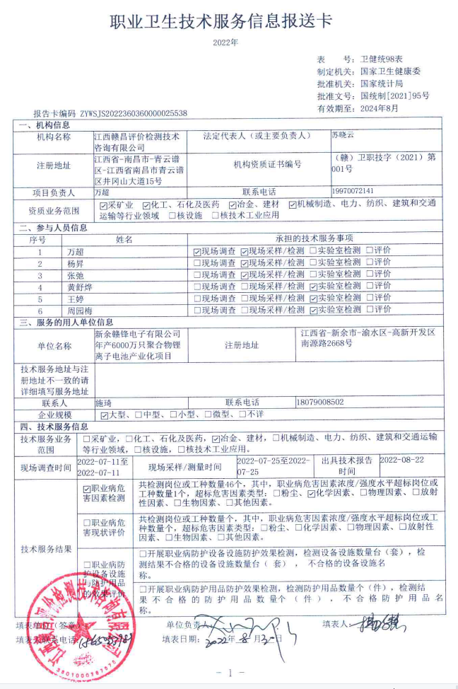 下一篇:江西贛鋒鋰電科技股份有限公司年產(chǎn)6億瓦時高容量鋰離子動力電池項(xiàng)目工作場所職業(yè)病危害因素檢測報(bào)告
