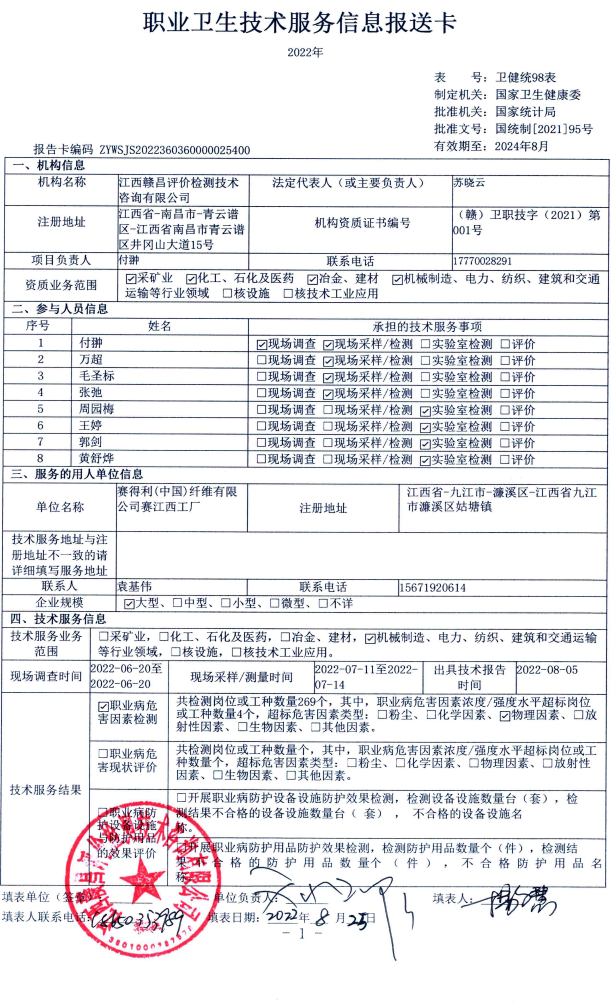 賽得利(中國)纖維有限公司賽江西工廠工作場所職業(yè)病危害因素檢測報告